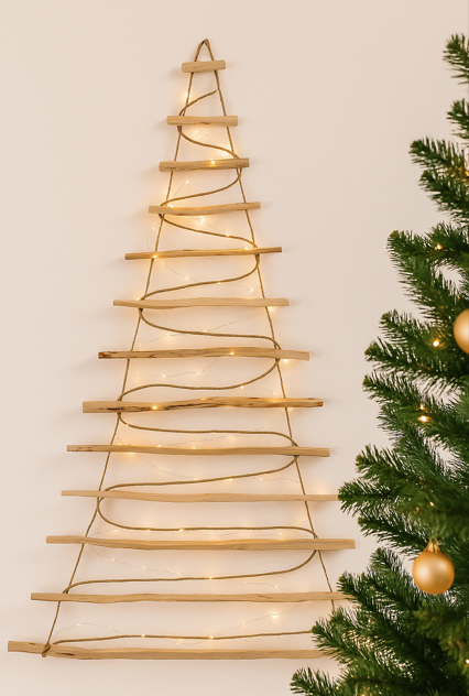 Houten kerstboom ladder gemaakt van hazelaarhout incl Sisal touw en verlichting